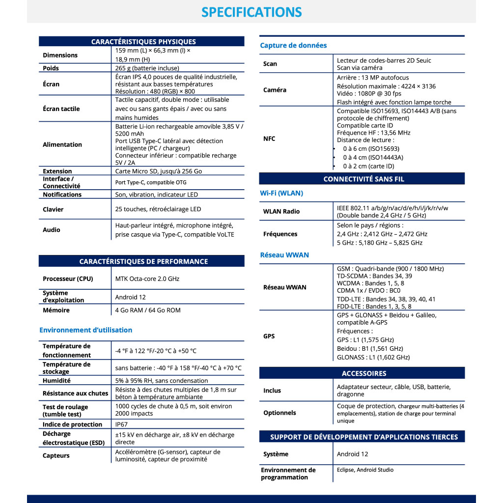 Un terminal tout écran performant et accessible, combinant design iconique, robustesse, batterie échangeable à chaud et excellente ergonomie pour une efficacité maximale.